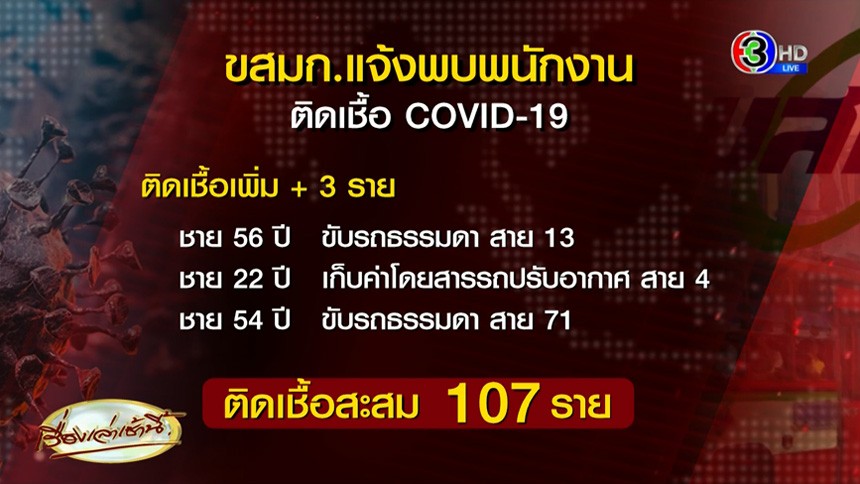 วานนี้ (31 พ.ค.) คณะทำงานศูนย์ปฏิบัติการภาวะฉุกเฉินโรคติดเชื้อไวรัสโคโรนา 2019 องค์การขนส่งมวลชนกรุงเทพหรือ ขสมก. แจ้งว่ามีพนักงานติดโควิด-19 เพิ่มอีกจำนวน 3 ราย ได้แก่