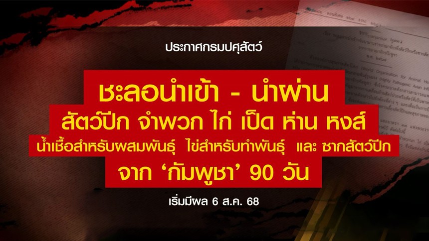 ประกาศ ชะลอนำเข้า-นำผ่าน สัตว์ปีกและซากสัตว์ปีก จากกัมพูชา 90 วัน หลังไข้หวัดนก H5N1 ระบาดในเขมร มีผลตั้งแต่วันนี้