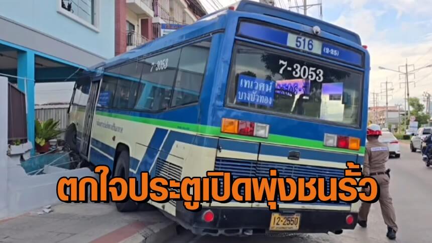 ระทึก คนขับรถเมล์ตกใจประตูเปิดเอง หักพ่วงมาลัยเสียหลักพุ่งชนกำแพงอู่รถ ถ.บางกรวย-ไทรน้อย คนขับกระโดดหนีออกจากรถเจ็บ ปิดการจราจร 1 ช่องทาง