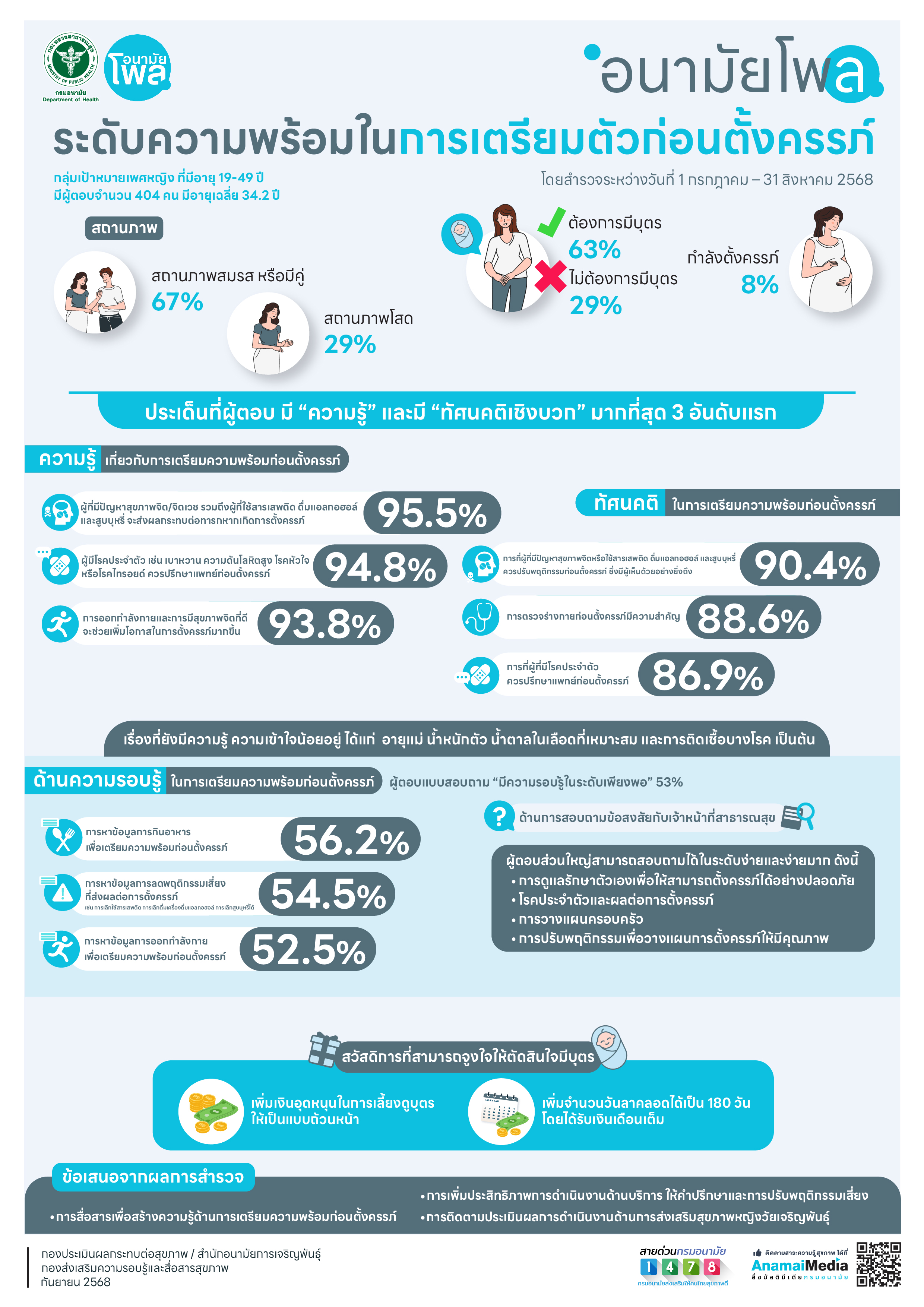 วันที่ 26 กันยายน 2568 กรมอนามัย กระทรวงสาธารณสุข เผยผลอนามัยโพล จากการสำรวจเรื่อง “ระดับความพร้อมในการเตรียมตัวก่อนตั้งครรภ์” สำรวจหญิงไทยอายุ 19-49 ปี จำนวน 404 คน พบว่า หญิงไทยยังมีความต้องการมีลูก 63% และมีความรอบรู้ด้านสุขภาพเพียงพอ 53%