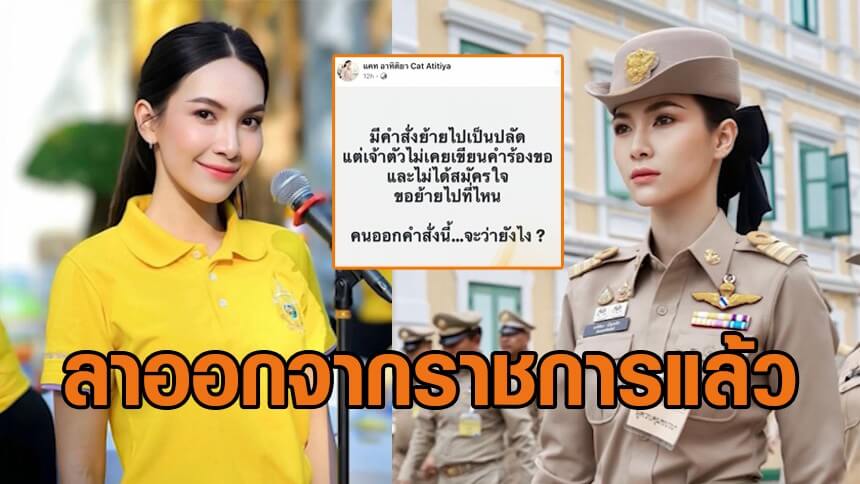 ผู้กองแคท ฝ่าดรามาเลื่อนยศไวติดเทอร์โบ โพสต์ “มีคำสั่งย้ายไปเป็นปลัด แต่เจ้าตัวไม่เคยเขียนคำร้องขอและไม่ได้สมัครใจ ขอย้ายไปที่ไหน คนออกคำสั่งนี้…จะว่ายังไง” ล่าสุดยื่นหนังสือลาออกจากราชการ แจ้งประสงค์ไปทำอาชีพอื่น
