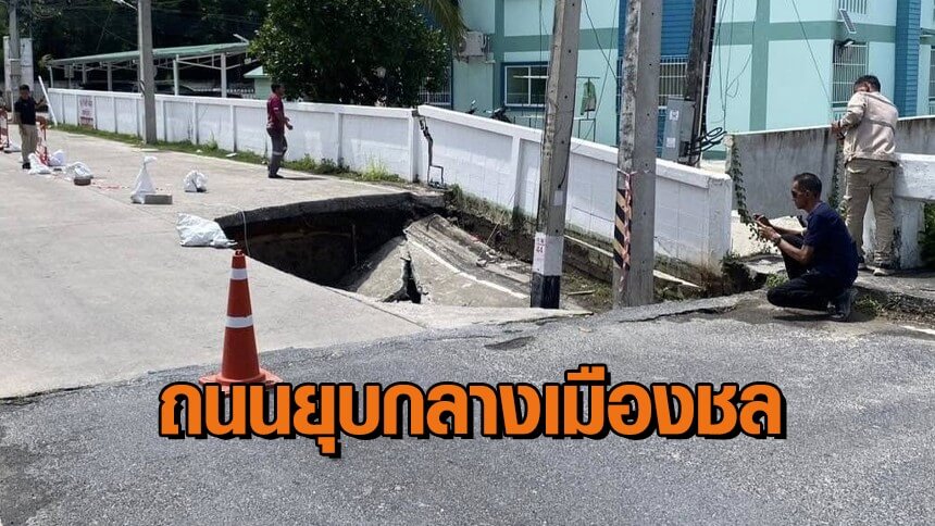 ชาวบ้านผวาเกิดเหตุถนนยุบลึกกว่า 3 เมตรกลางเมืองชลบุรี เจ้าหน้าที่ต้องปิดถนนเพื่อเร่งแก้ไข ชาวบ้านเผยนาทีถนนทรุด ผู้รับเหมาเผยสาเหตุน้ำกัดเซาะริมตลิ่งใต้สะพาน