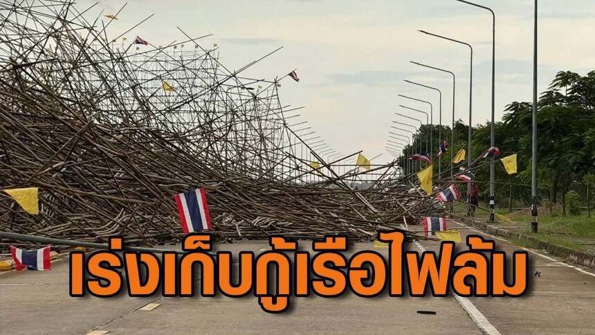 เร่งเก็บกู้เรือไฟสูงเท่าตึก 20 ชั้น หลังต้านไม่ไหว โดนพายุฝนพัดล้ม