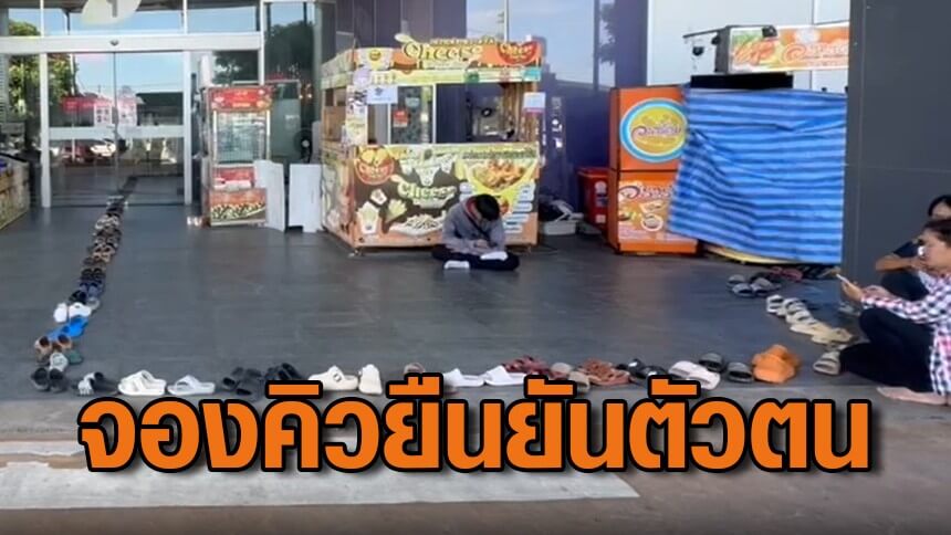 ชาวบ้านถอดรองเท้าจองคิวยาวเหยียด รอธนาคารเปิดทำการ ยืนยันตัวตนโครงการคนละครึ่งพลัส