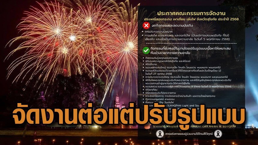 งดกิจกรรมและการแสดงบันเทิง ได้แก่ การประกวดนางนพมาศ, การเล่นไฟ การแสดงพลุ และดอกไม้ไฟ (เว้นแต่การแสดงพลุสุโขทัย ที่ไม่มีเสียงดัง และเพื่อเป็นการถวายความอาลัย ในวันที่ 5 พ.ย. 2568)