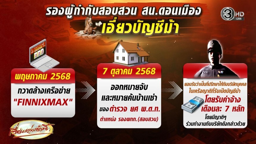 ให้ออกจากราชการ ตำรวจ ยศ พ.ต.ท. ดีกรี รอง ผกก.สน.ดอนเมือง เอี่ยวแก๊งคอลเซ็นเตอร์ รับเป็นที่ปรึกษาให้กับบริษัทบุคคลในเครือญาติรับเปิดบัญชีม้า ได้ค่าจ้างเดือนละ 7 หลัก แต่เนียนใช้ชีวิตสมถะ เพื่อนร่วมงานเผยแต่งตัวธรรมดา รถยนต์ก็เป็นรถแบรนด์ญี่ปุ่นธรรมดา อยู่บ้านเช่า ไม่มีอะไรที่น่าสงสัยว่ารวยมาจากไหน