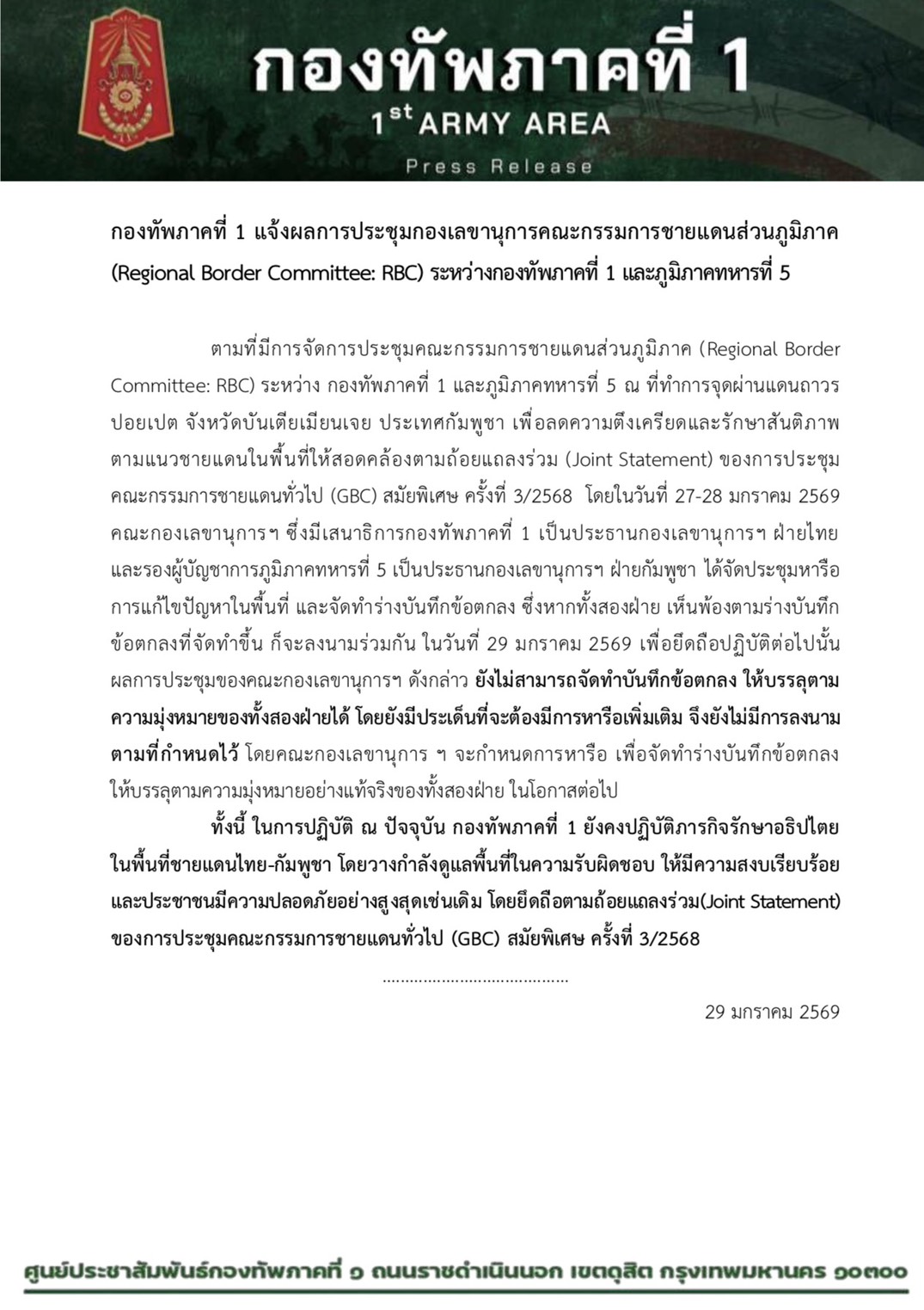 กองทัพภาคที่ 1 โพสต์ข้อความผ่านทางเฟซบุ๊ก แจ้งผลการประชุมกองเลขานุการคณะกรรมการชายแดนส่วนภูมิภาค (Regional Border Committee: RBC) ระหว่างกองทัพภาคที่ 1 และภูมิภาคทหารที่ 5 ของกัมพูชา ระบุว่า ตามที่มีการจัดการประชุมคณะกรรมการชายแดนส่วนภูมิภาค (Regional Border Committee: RBC) ระหว่าง กองทัพภาคที่ 1 และภูมิภาคทหารที่ 5 ณ ที่ทำการจุดผ่านแดนถาวรปอยเปต จังหวัดบันเตียเมียนเจย ประเทศกัมพูชา เพื่อลดความตึงเครียดและรักษาสันติภาพตามแนวชายแดนในพื้นที่ให้สอดคล้องตามถ้อยแถลงร่วม (Joint Statement) ของการประชุมคณะกรรมการชายแดนทั่วไป (GBC) สมัยพิเศษ ครั้งที่ 3/2568