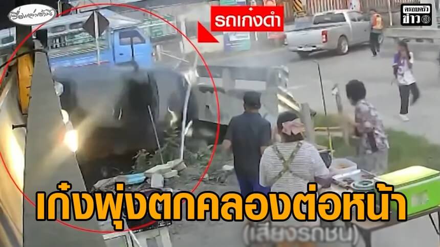 โดยมีภาพจากกล้องวงจรปิด เห็นบรรยากาศยามเช้าประชาชนกำลังยืนซื้อหมูปิ้งกันอยู่ จู่ๆ รถกระบะคันสีดำได้เสียหลักพุ่งตกลงคลอง ซึ่งหากไม่มีคลองกั้น คาดว่าอาจจะชนเข้ากับร้านหมูปิ้ง สร้างความแตกตื่นอย่างมาก