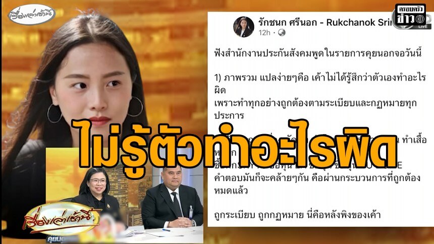 “ษัษฐรัมย์” ซัดระบบราชการทำคนเก่งเสียของ สอนมวยประกันสังคม แจงสรยุทธ ปมงบบริหารจ้างพนักงาน หารออกมาตกคนละ 80 บาท ควรดูที่ประสิทธิภาพ ไม่ใช่หารต่อหัว ด้าน ‘ไอซ์ รักชนก’ ร่ายยาว 8 ข้อ หลังฟัง ‘สปส.’ ออกรายการ ‘กรรมกรข่าว คุยนอกจอ’ ฉะมายเซตน่ากลัว-อันตราย ไม่รู้ตัวเองว่าทำอะไรผิด ยึดหลังพิง ทำทุกอย่างถูกต้องตามระเบียบและกฎหมาย ลั่นทำหน้าที่อย่างสุดกำลังแล้ว ที่เหลือต่อจากนี้อยู่ที่ผู้ประกันตน