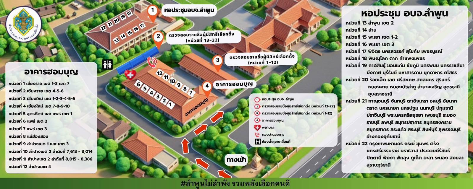 ในวันที่ 1 กุมภาพันธ์ 2569 ตั้งแต่เวลา 07.30 น. เป็นต้นไป ณ ที่เลือกตั้งกลาง (หอประชุมองค์การบริหารส่วนจังหวัดลำพูน)