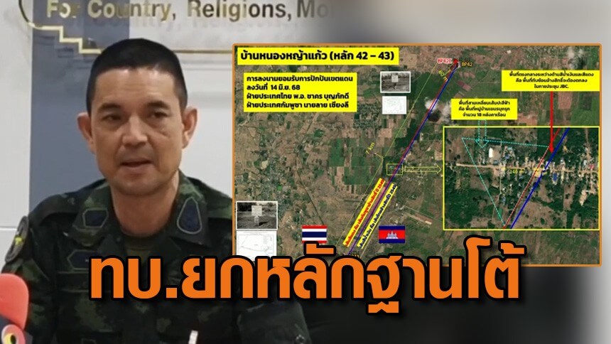 โฆษก ทบ.โต้ ฮุนมาเนต เรียกร้องคงสภาพพื้นที่พิพาท จ.สระแก้ว ตาม MOU บอกให้ย้อนดู 20 ปี กัมพูชาแปลงสภาพ ตั้งชุมชน พื้นที่อ้างสิทธิ์ รุกเข้าเขตไทย บ้านหนองจาน-หนองหญ้าแก้ว ช่องบก ยกหลักฐานภาพถ่ายทางอากาศ