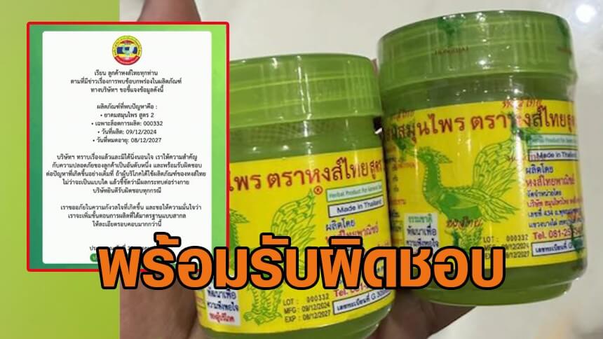 ยาดม 'หงส์ไทย' แจงปม อย.พบล็อตปนเปื้อน พร้อมรับผิดชอบ หมอเผยใครสูดแล้วเสี่ยงป่วย