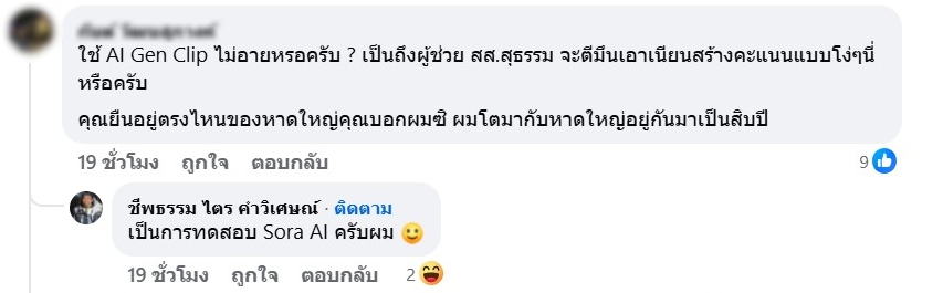 นอกจากนี้ นายชีพธรรม ยังได้ชี้แจงใต้โพสต์คลิปดังกล่าวด้วยว่า “เป็นการทดสอบ Sora AI ครับผม”