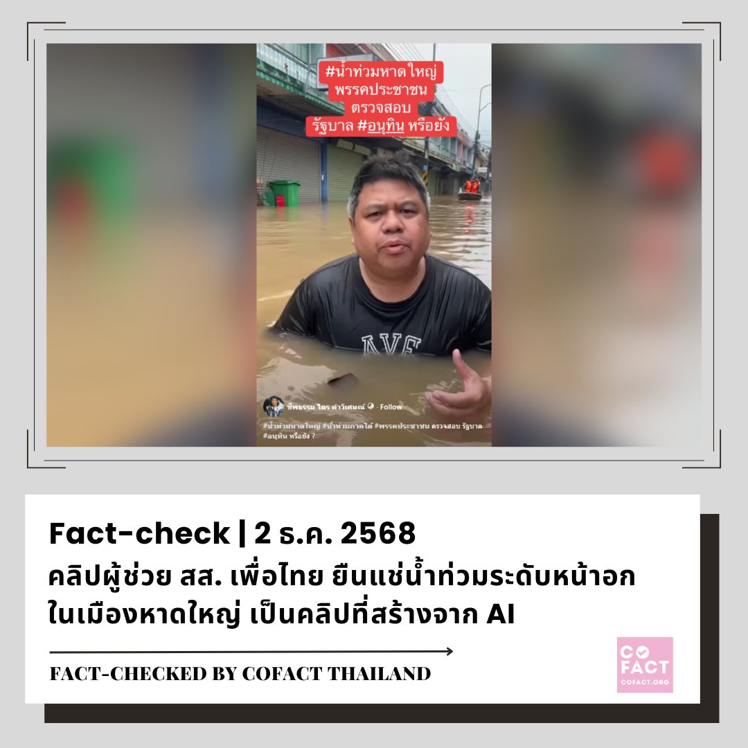 แท็กที่เกี่ยวข้อง ผู้ช่วย สส.เพื่อไทย ,น้ำท่วมหาดใหญ่ ,คลิป AI ,Cofact