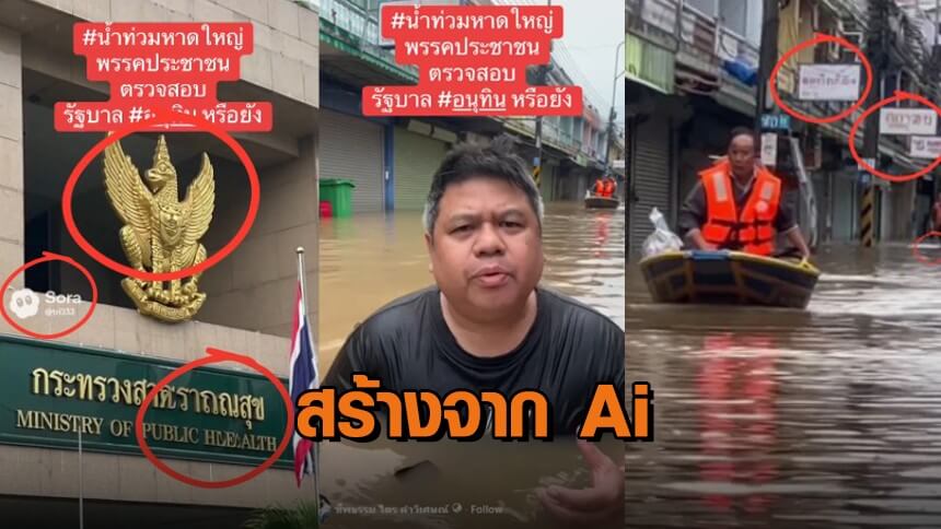 โคแฟคตรวจสอบ: ภาพเกือบทั้งหมดในคลิปนี้สร้างจาก Sora ซึ่งเป็นโมเดลเอไอของ OpenAI เจ้าของเดียวกันกับ ChatGPT สังเกตได้จากโลโกและชื่อแอปพลิเคชันที่ปรากฏอย่างชัดเจนตลอดทั้งคลิป รวมถึงยังพบความผิดปกติหลายจุด เช่น ป้ายชื่อร้านค้าในเมืองเป็นกลุ่มคำที่ไม่มีความหมาย ป้ายกระทรวงสาธารณสุขที่สะกดผิดทั้งภาษาอังกฤษและไทย ครุฑสีทองหน้าอาคารที่มีลักษณะต่างกับตราครุฑของจริง และระดับน้ำท่วมที่ไม่สอดคล้องกันโดยเปรียบเทียบจากคำบรรยายว่า “น้ำท่วมเกือบถึงเอว” แต่บริเวณพื้นหลังน้ำท่วมสูงแค่ระดับข้อเท้า