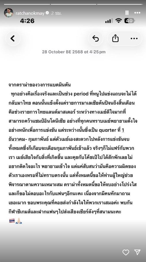 แต่ระหว่างนั้นเป็นควอเตอร์ที่ 1 ธันวาคม – กุมภาพันธ์ แต่ตัวเมย์เองสะดวกไปหลังการแข่งขันจบทั้งหมด ซึ่งก็เกือบจะเดือนกุมภาพันธ์เข้าแล้ว จริงๆ ก็ไม่แฟร์กับพวกเรา เมย์เสียใจกับสิ่งที่เกิดขึ้น และคุยกับโค้ชเป้ไปได้สักพักเลยไม่อยากติดใจอะไร พยายามเข้าใจ แต่แค่สับสนว่ามันคือความผิดของตัวเองเราเองเหรอที่ไม่ทราบตรงนั้น