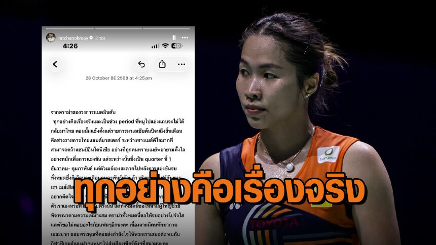 “เมย์ รัชนก อินทนนท์” นักแบดมินตันหญิงเดี่ยวของไทย และอดีตแชมป์โลก ออกมาโพสต์สตอรีอินสตาแกรม ยืนยันดรามาวงการแบดมินตัน ทุกอย่างคือเรื่องจริง กรณีถูกหักเบี้ยเลี้ยง ทีมชาติไทย ชุดซีเกมส์ จาก จาก 60,000 บาท เหลือเพียง 6,000 บาท เนื่องจากไม่เข้ารับการตรวจร่างกาย ตามระเบียบของการกีฬาแห่งประเทศไทย โดยระบุว่า