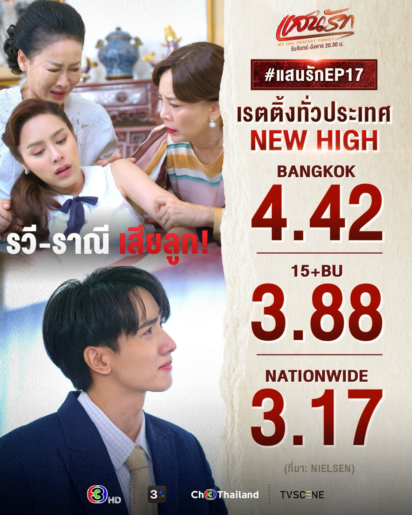 ล่าสุดส่งเรตติ้งพุ่งแรงทำสถิติเรตติ้ง New High ทุกพื้นที่ สำหรับ อีพี 16 ในกลุ่มคนดู กรุงเทพฯ คว้าไปที่ 4.7 ส่วนกลุ่ม 15 BU+ (Bangkok and Urban) ฟาดไปถึง 3.9 ทั่วประเทศคว้าไปได้สูงถึง 3.1 สำหรับ อีพี 17 กรุงเทพฯ ทำไป 4.42 กลุ่ม 15 BU+ (Bangkok and Urban) คว้าไป 3.88 ทั่วประเทศทำไปได้สูงถึง 3.17 นอกจากนี้ยังทำลายยอดสถิติสูงสุดบนแอปพลิเคชัน 3Plus ถึง 191,780K งานนี้แฟนละครเทใจให้ความเห็นใจ จนแรงส่งพาเรตติ้งพุ่งไม่หยุด! กับฉากเปิดตัวโรงหนังซึ่งเป็นการรวมตัวของ 4 พี่น้องที่หลายคนรอคอย ทำเอาน้ำตาแตกกันทุกคน แต่หลังจากนั้นก็ทำคนดูถึงกับหัวร้อน เพราะ ราณี (พีพี ปุญญ์ปรีดี) ดันแท้งลูกจนรวีของขึ้นบุกไปประกาศศึกกับม้าเหมยถึงบ้าน! จนกลายเป็นละครที่ทุกคนต้องดูแบบห้ามกระพริบตาเลยทีเดียว
