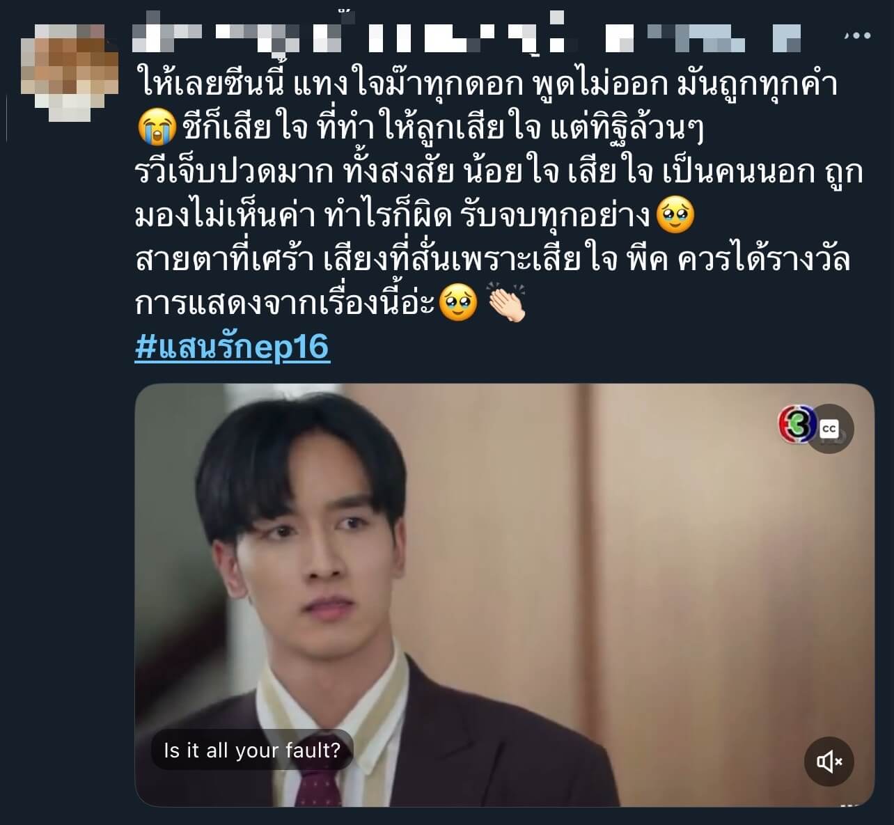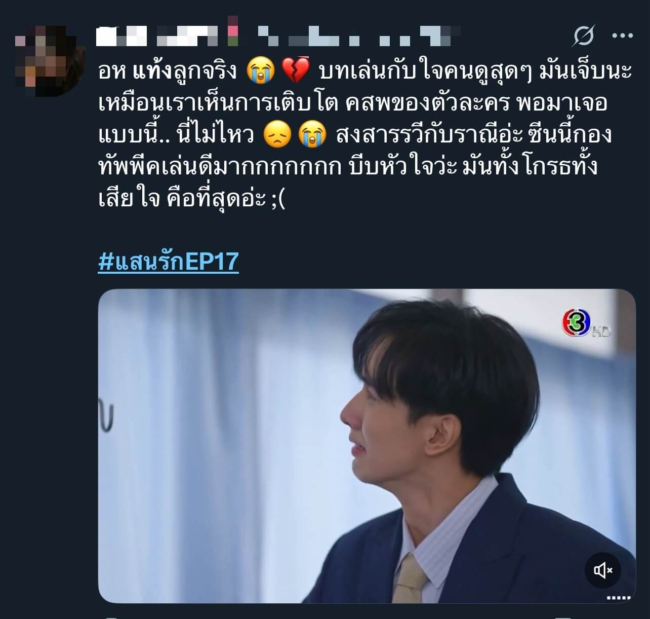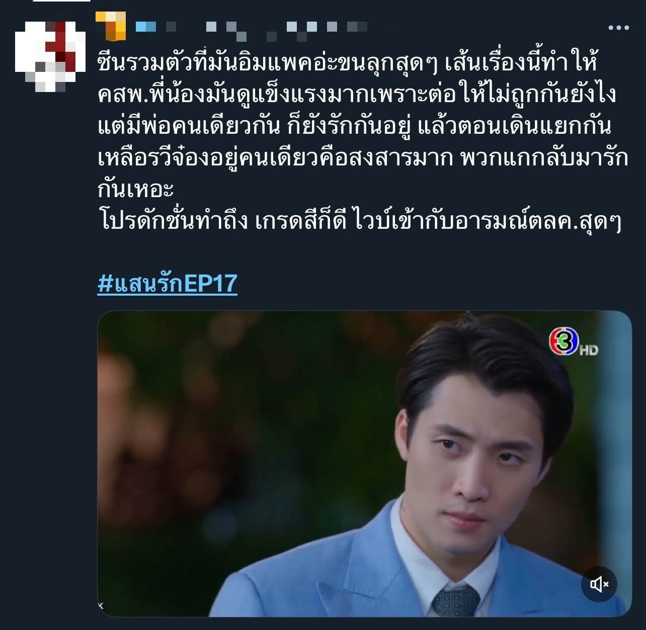 แรงไม่หยุด ฉุดไม่อยู่จริง ๆ สำหรับละครครอบครัวสุดดราม่า “แสนรัก” ทางช่อง 3 ที่เรียกเสียงฮือฮากันทั้งประเทศ เพราะไม่ว่าจะเจอมรสุมเรื่องราวลูก ๆ คนไหน แต่คนที่โดนดราม่าถาโถมมาตลอดก็ คือลูกชายนอกสายตา รวี (กองทัพ พีค) จนกลายเป็นกระแสสนั่นโซเชียล ทำดีให้ตายยังไงก็ไม่อยู่ในสายตา คุณนายเหมย (ต่าย เพ็ญพักตร์) อีกทั้งพี่น้อง รัก (มีน พีรวิชญ์) รณกร (ตี๋ ธนพล) ยังมาผิดใจกันเอง แถม เฉิน (สิงโต สกลรัฐ) ยังเข้ามาปั่นหัวจนบ้านตรงพานิชย์ลุกเป็นไฟ