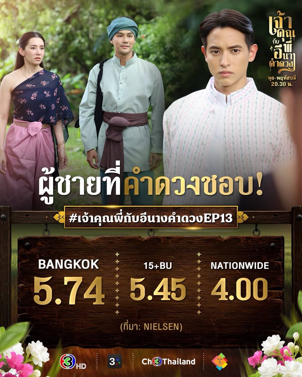 พูดถึง EP13 เมื่อ ขาม(เพ็ชร ฐฤกต) “ผู้ชายที่คำดวงชอบ” ปรากฏตัว ความสงบของเรือนก็พังครืน! ขุนเอก (เจมส์ จิรายุ) ถึงกับออกอาการหึงไม่ไหว ทั้งสายตา น้ำเสียง และท่าทีที่เปลี่ยนไปอย่างชัดเจน ยิ่งส่งให้บรรยากาศระหว่างขุนเอกกับแม่คำดวง (เบลล่า ราณี) น่ารักน่าหยิก จนแฟนละครหยุดยิ้มไม่ได้ ส่งผลให้เรตติ้งพุ่งแรงสุด ๆ ในพื้นที่กรุงเทพฯ 5.74 และทั่วประเทศ 4.00 สำหรับ EP14 ก็ยิ่งแรงเข้าไปอีก เพราะความสัมพันธ์ของทั้งคู่พัฒนาไปอีกขั้น เมื่อขุนเอกเลิกปากหนัก ยอมสารภาพรักต่อหน้าคำดวง พร้อมมอบ “จูบมัดจำ” กลางเรือนที่อบอุ่น และสร้างความเขินจนคนดูฮ็อบลั่นโซเชียลดัน #ทีมคำดวง ติดเทรนด์อีกครั้ง! เรตติ้งกรุงเทพฯ ยังแข็งแกร่งที่ 5.63 แม้ทั่วประเทศจะอยู่ที่ 3.76