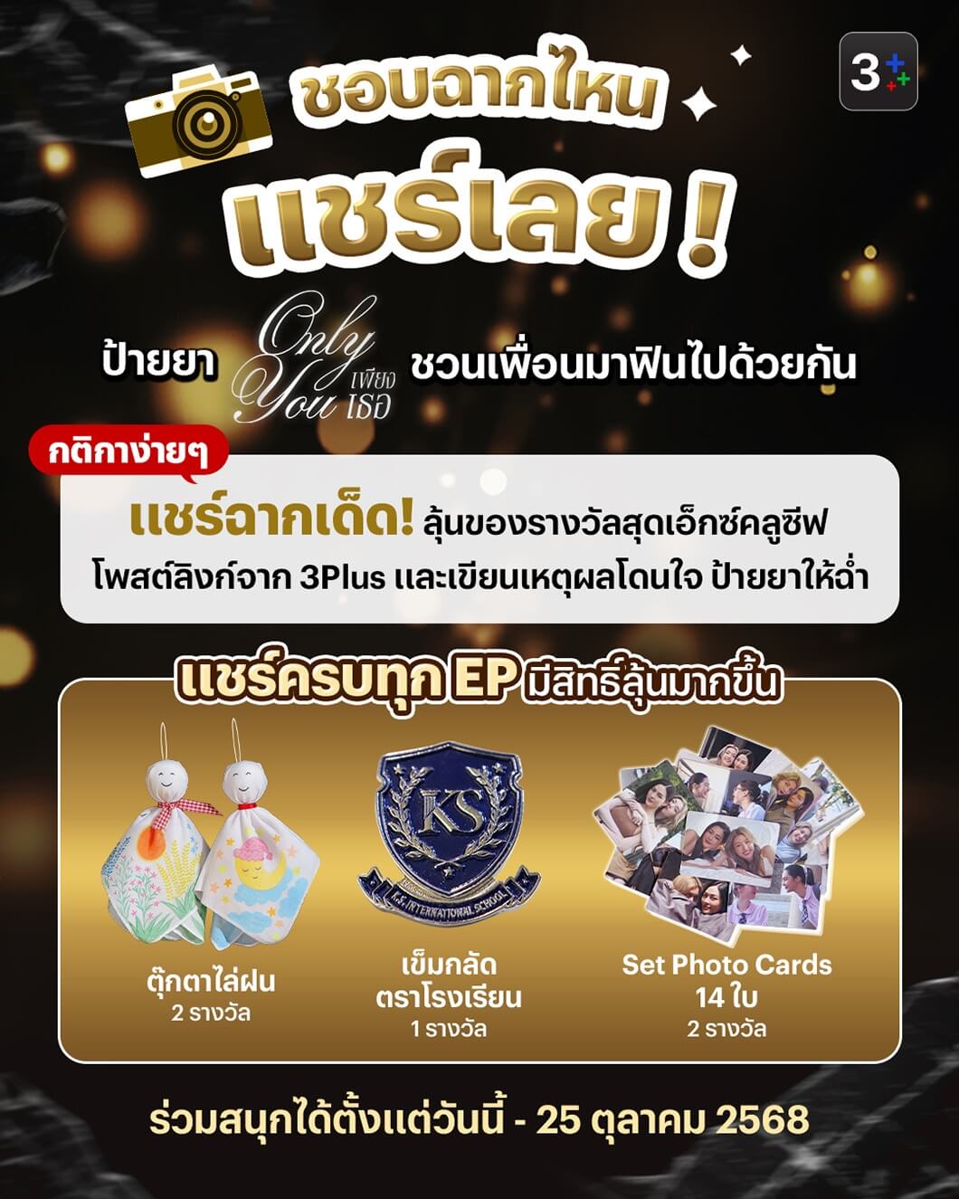 ซีรีส์จบแล้ว แต่กระแสความฟินยังแรงต่อเนื่อง! สำหรับสองนางเอกสาว หลิงหลิง คอง และ ออม กรณ์นภัส งานนี้ 3Plus เลยขอชวนแฟน ๆ มาร่วมกิจกรรมสุดพิเศษ “แชร์ซีนเด็ด EP ที่ชอบ” บนแอปพลิเคชัน 3Plus เพื่อลุ้นรับของรางวัลสุดเอ็กซ์คลูซีฟเป็นของที่ระลึกจากซีรีส์ กติกาการร่วมสนุกง่ายๆ เพียงแค่เลือกฉากโปรด แชร์ลิงก์ของ EP. นั้นๆ พร้อมบอกเหตุผลว่าทำไมถึงประทับใจ และป้ายยาชวนเพื่อนๆ ให้มาฟินไปด้วยกัน พลาดไม่ได้! กับของรางวัลสุดพิเศษที่มีจำนวนจำกัด